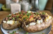 New Dish! Over 1 pound of a loaded Steak baked potato piled high with shaved beef steak, butter, cheddar cheese, crumbled bacon, green onions and sour cream. 650 calories, 61g carbs, 27g protein per serving.